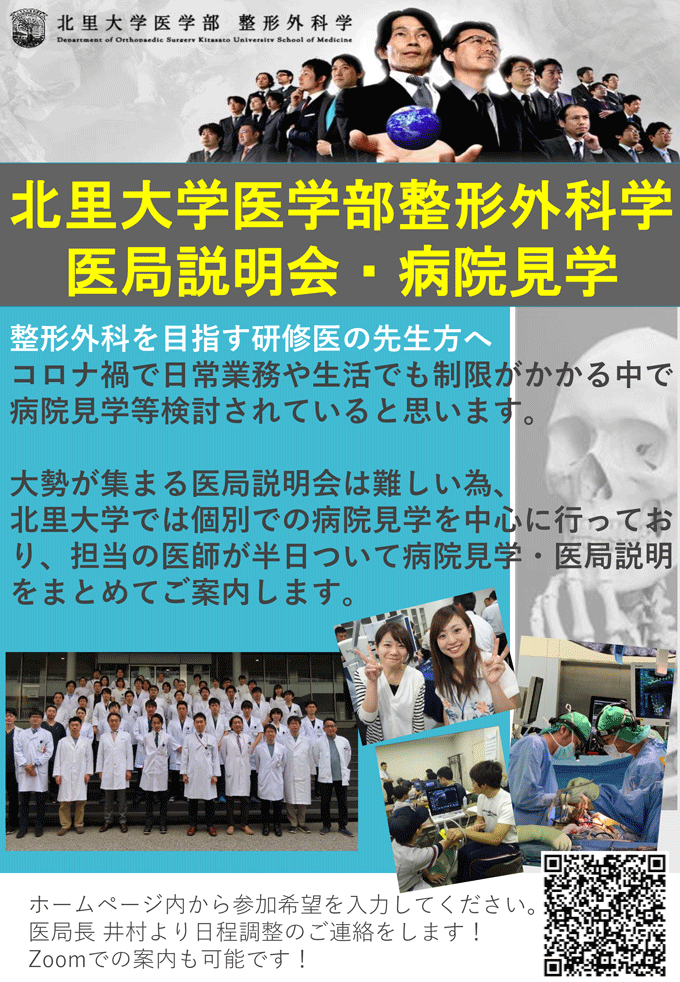 北里大学医学部整形外科学教室では、例年医局説明会やハンズオンセミナーを企画し、20名以上の研修医の先生方に参加していただいて、実際の手術機材を用いてのトライアルや、研修プログラム説明、大学院での生活や留学の紹介を行っておりました。しかし、昨年度からはコロナウィルス感染対策の規定に則り、個別での病院見学を主体としておりますが、今年度に至るまで既に多くの先生方に見学に来ていただいています。見学にいらした先生には担当医師が付き添い、病院内の案内から研修プログラムの説明まで行っております。