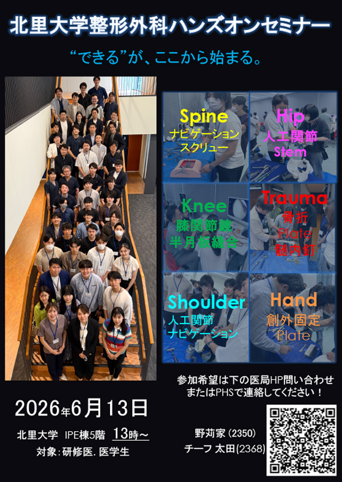 脊椎、股関節や肩関節の人工関節、関節鏡、骨折、手の外科等1日で様々な整形外科手術を体験し北里大学の整形外科総出で指導、トレーニングを行います!